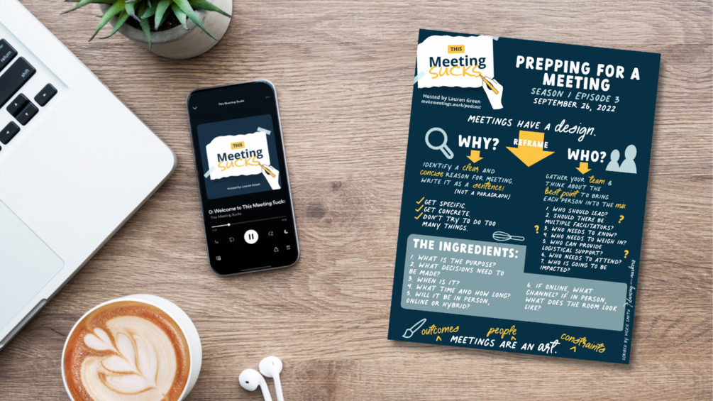 Visual notes from This Meeting Sucks Episode 3: Prepping for a Meeting designed by a member of the Dancing with Markers team.